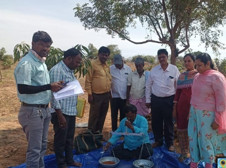 ముదిగుబ్బ మండలంలో మంగళవారం వ్యవసాయశాఖ, గణాంకశాఖ అధికారుల ఆధ్వర్యంలో కంది పంటకోత ప్రయోగాలను నిర్వహించారు. మండలపరిధిలోని గుంజేపల్లి గ్రామంలో ఓబులప్ప అనురైతు పొలంనందు కంది పంటను 10మీటర్లు పొడవు 10మీటర్లు వెడల్పు విస్తీర్ణంలో కోతకోసి నిర్వహించిన ప్రయోగంలో 690 గ్రాముల దిగుబడి వచ్చినట్లు అధికారులు ధ్రువీకరిస్తూ ఈమేరకు ఎకరాకు 34.5 కేజీల దిగుబడి రానున్నట్లు నమోదు చేసుకున్నారు. అదేవిధంగా దొరిగల్లు గ్రామంలో మహిళారైతు బొజ్జమ్మ పొలంనందు కంది పంటకోత ప్రయోగం నిర్వహించారు. ఈకార్యక్రమంలో జిల్లా అర్థ గణాంకశాఖ అధికారి విజయకుమార్, మండల వ్యవసాయశాఖ అధికారి లక్ష్మీనరసింహులు, మండల సహాయ గణాంకఅధికారి మాదినేని చంద్రశేఖర్, మండల వ్యవసాయవిస్తరణ అధికారి షర్ఫుద్దీన్, గ్రామవ్యవసాయ సహాయకులు, రైతులు తదితరులు పాల్గొన్నారు.