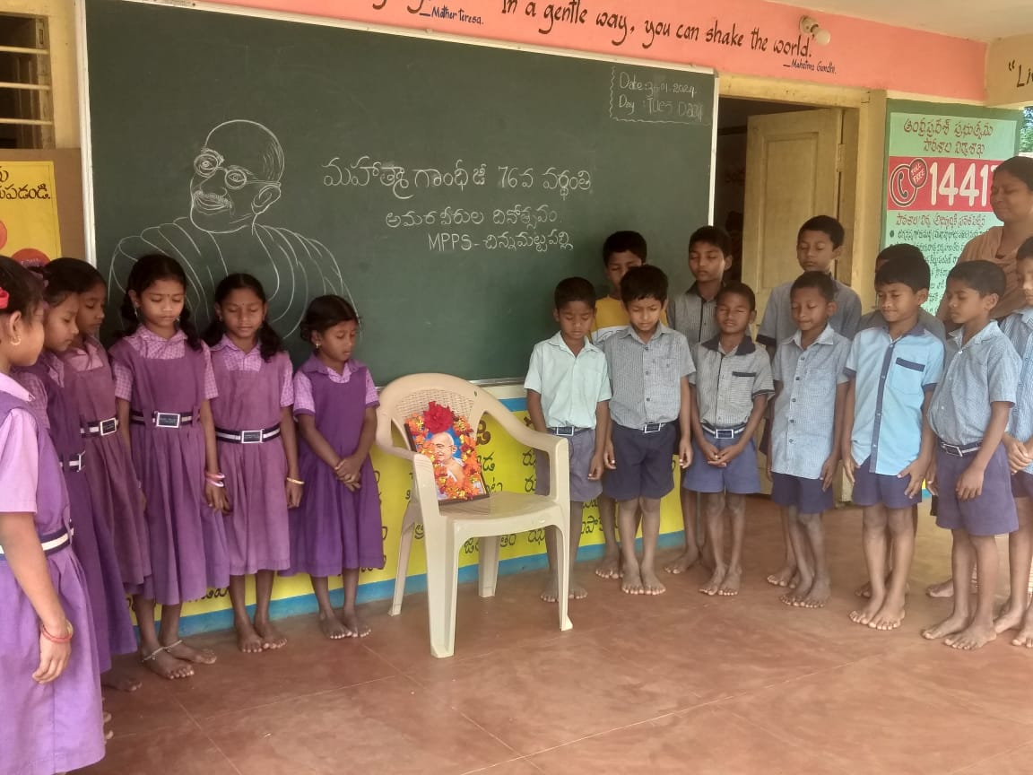 మండల పరిధిలోని చినమట్టపల్లి మండల పరిషత్ ప్రాథమిక పాఠశాలలో, మహాత్మాగాంధీ 76వ వర్థంతి కార్య క్రమంని మంగళవారం ప్రధానోపాధ్యాయులు ఎస్.నాగేశ్వరరావు ఆధ్వర్యంలో నిర్వహించారు. ఈ సందర్భంగా వర్థంతీ సభకు ముందు మహాత్మాగాంధీ చిత్రపటానికి పూల మాలవేసి, ఘన నివాళ్లర్పించారు. సహోపాధ్యాయురాలు టి.విజయకుమారి అధ్యక్షతన జరిగిన సభలో ప్రధానోపాధ్యాయులు ఎస్.నాగేశ్వరరావు విద్యార్థులనుద్దేశించి మాట్లాడుతూ భారతదేశ, ప్రజల నిర్దిష్ట పరిస్థితులను లోతుగా అధ్యయనం చేసి, ఆకళింపు చేసుకున్న స్వాతంత్ర్య ఉద్యమ నేతల్లో మహాత్ముడు అగ్రగణ్యులని పేర్కొన్నారు. గాంధీజీ మత సామరస్యం కోసం అహర్నిశలు పని చేశారని తెలిపారు. దేశంలో అణగారిన బడుగు, బలహీన వర్గాలు, స్త్రీల విముక్తి కోసం గాంధీజీ పోరాటం చేశారని, నాగరికతకు, ఊరికి దూరంగా నెట్టబడిన దళితులు, బలహీన వర్గాలను, హరి జనులను జన జీవన స్రవంతిలోకి తీసుకురావడానికి సమాజం అంగీకరించేలా హరిజనోద్దరణ , సహపంక్తి భోజనాలు పెద్ద ఎత్తున జరిపేలా సంస్కరణోద్యమం నడిపిన నేత మహాత్ముడని కొనియాడారు. నేటి విద్యార్థులు మహాత్మాగాంధీ అనుసరించిన సూత్రాలను పాటించాలనీ, గాంధీజీ పాటించిన క్రమ శిక్షణను పాటించాలని విద్యార్థులకు సూచించారు. ఈ కార్యక్రమంలో విద్యార్థులు, శానిటేష అయాలు, కమ్యూనిటీ వర్కర్లు పాల్గొన్నారు.