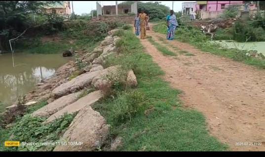గత ప్రభుత్వంలో చెరువు కాల్వ పూడ్చి ఓ నాయకుడు వేసిన లేఔట్‌కి రోడ్డు ఏర్పరచుకున్నారు. దీనిపై ఇరిగేషన్ అధికారులు కూడా కనీసం నోటీసు ఇవ్వలేదు. “కాల్వపైనే దారి వేయడం చూసినా ఎవరూ ఆపలేదు” అని ప్రజలు మండిపడుతున్నారు.