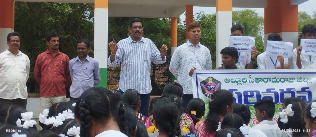 వి.ఆర్.పురం :మత్తు మాదక ద్రవ్యాలకు నేటి యువత, విద్యార్థులు దూరంగా ఉండాలనీ, స్థానిక ఎస్ఐ నాగరాజు అన్నారు. జాతీయ మత్తు మాదక ద్రవ్యాల నివారణ దినోత్సవాన్ని పురస్కరించుకొని, పరివర్తన అనే కార్యక్రమం ద్వారా జిల్లా ఎస్పీ ఆదేశాల మేరకు బుధవారం మండల కేంద్రం వి ఆర్ పురం గ్రామంలో జిల్లా పరిషత్ ఉన్నత పాఠశాల విద్యార్థులచే పోలీసుల ఆద్వర్యంలో బుధవారం భారీ అవగాహన ర్యాలీని నిర్వహించారు. ఈ సందర్భంగా రాజీవ్ గాంధి సెంటర్లో ఏర్పాటు చేసిన సమావేశంలో ఎస్ఐ నాగరాజు మాట్లాడుతూ మత్తు మాదక ద్రవ్యాలతో యువత తమ జీవితాలను నాశనం చేసుకోవద్దని, మత్తు మాదక ద్రవ్యాల వినియోగంపై వాటి నివారణకు వాటి వల్ల కలిగే నష్టాలను వివరిస్తూ విఆర్ పురం ఎస్సై కే నాగరాజు విద్యార్థులకు వివరించారు. ఈనాటి యువతరాన్ని దారి మళ్ళించి చెడు మార్గాల్లో నడిపిస్తున్న దురలవాట్లలో మాదక ద్రవ్యాల వినియోగం తీవ్రమైనదనీ, ధూమపానం మద్యపానం వంటి వ్యసనాలకు దూరంగా ఉండాలని సూచించారు. నల్లమందు, మార్ఫిన్, వీటికి అలవాటు పడిన విద్యార్థులు, యువకులు చదువులు వదిలి సర్వస్వం కోల్పోయి నిర్భాగ్యులౌతున్నారనీ. ఒకసారి దీనికి బానిసలైతే తమభావి బంగారు భవిష్యత్తును ఆదిలోనే తుంచేసుకోవద్దని స్పష్టం చేశారు. ఈ కార్యక్రమంలో విఆర్ పురం జిల్లా పరిషత్ హై స్కూల్ ఉపాధ్యాయులు, విఆర్ పురం పోలీస్ శాఖ ఏఎస్ఐ రాధాకృష్ణ, పోలీస్ సిబ్బంది విద్యార్థిని విద్యార్థులు తదితరులు పాల్గొన్నారు.