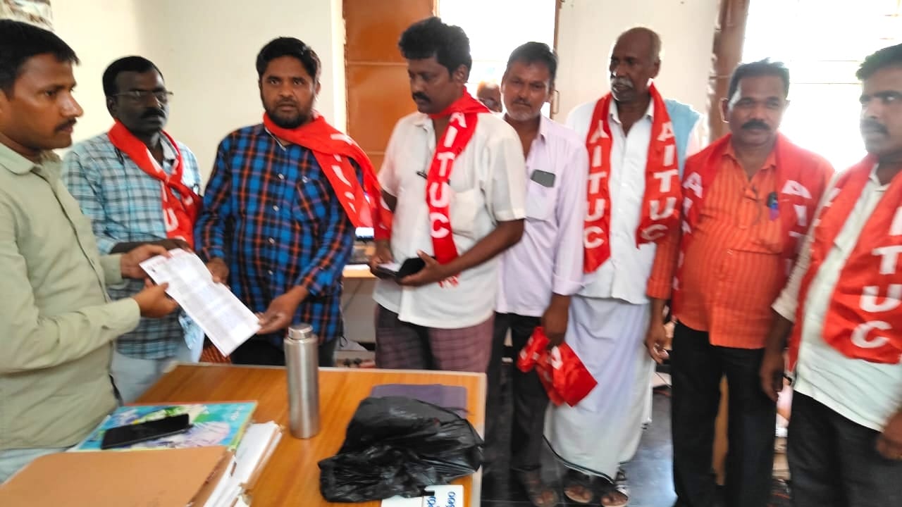 పోరుమామిళ్ల:కార్మికులపై బెదిరింపులు మానుకో వాలని,వారినితొలగింపు చర్యలకు పూనుకోవడం గాని,వేధింపులకు దిగడం జరిగితే సహించేది లేదని ఏఐటీయూసీ జిల్లా కార్యదర్శి పిడు గు మస్తాన్ పేర్కొన్నారు. తొలగింపు చర్యలుఆపాలని మండల డిప్యూటీ తహసిల్దార్ సంజీవరెడ్డికిఏఐటీయూ సీ ఆధ్వర్యంలోవినతిపత్రంసమర్పిం చారు. ఈసందర్భంగా ఆయన మాట్లాడుతూ గత ప్రభుత్వంలో నియమితు లయ్యారన్న సాకుతో వివిధప్రభుత్వ స్కీంలలో పనిచేస్తున్న (అంగన్వాడి, ఆశ,మధ్యాహ్నం భోజనం) ఉపాధి హామీ పథకం ఫీల్డ్ అసిస్టెంట్లు, డ్వా క్రా సంఘాల లీడర్లు,స్వచ్ఛభారత్ కార్మికులు చిరుద్యోగులను మాను కోవాలని అధికారులతో తొలగించే విధానాలకు స్వస్తి పలకాలని ఏఐటియుసి రాష్ట్రవ్యాప్త పిలుపులో భాగంగా సోమవారం పోరుమామిళ్ల మండల డిప్యూటీ తహసిల్దార్ సంజీవ్ రెడ్డికి ఏఐటీయూసీ మండల సమితి వినతి పత్రం సమర్పించారు రోజువారీ వేతనం మీద ఆధారపడి బతుకుతున్న చిరుద్యోగులును అధికార పార్టీ నాయకులు మాటలు విని ఉపాధి అవకాశాలను తొలగిస్తే జీవించడమే కష్టమవుతుంది. ఇలాంటి చర్యలను ప్రజలు హర్షించరు. గతంలో ఆ పార్టీ చేసింది కదా మేము అధికారంలోకి వచ్చాం మేము చేస్తామని సమర్థించుకోవడం సరైనది కాదన్నారు. పార్టీలకు అధికారం శాశ్వతం కాదు, కానీ ప్రజలకు వివిధ సేవలు అందించాల్సిన ప్రభుత్వ యంత్రాంగం మాత్రం శాశ్వతం. ఏ పార్టీ అధికారంలో వున్నా ఈ యంత్రాంగం ద్వారానే ప్రజాపాలన అందించాలి. రాష్ట్రంలో సుమారు నాలుగు లక్షల మంది కార్మికులు వివిధ ప్రభుత్వ పథకాల అమలులో భాగంగా పనిచేస్తున్నారు. అంగన్వాడీ సెంటర్లలో లక్ష మందికి పైగా, మధ్యాహ్న భోజన ఏజెన్సీల కింద 80 వేల మంది, ఆశా కార్మికులుగా 45 వేల మంది, ఆర్పీలుగా మరో 28 వేల మంది విధులు నిర్వహి స్తున్నారు. వీరిలో అత్యధికమంది పెద మహిళలు.