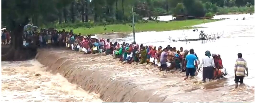 ** ప్రమాదకర స్థాయిలో పొంగుతున్న అన్నవరం వాగును దాటుతున్న ప్రజలు.