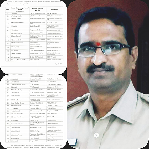 సాధారణ బదిలీలో భాగంగా సత్యవేడు సర్కిల్ ఇన్స్పెక్టర్ గా ఎమ్. మురళి ని నియమిస్తున్నట్టు అనంతపురం రేంజ్ డిఐజి షిముషి బాజ్ పెయ్ ఉత్తర్వులు జారీ చేశారు. తిరుపతి పి టి సి లో ఉన్న మురళి ని సత్యవేడు బదిలీ చెయ్యగా, సత్యవేడు లో ఉన్న దివాకర్ రెడ్డీ ని వి ఆర్ ఎస్ పి తిరుపతి కి బదిలీ చేశారు.