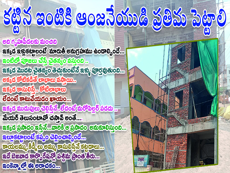 బెజవాడ కార్పొరేషన్ లో 64 డివిజన్లు తూర్పు, మద్య, పశ్చిమ నియోజకవర్గ పరిధిలో నిర్మాణాలు జోరుగా జరుగుతున్నాయి.అయితే పశ్చిమ పరిధిలోకి వెళ్తే అక్కడ ఆచ్చర్యక సంఘటనలు జరుగుతున్నాయి.ఇల్లు నిర్మించుకోవాలంటే అందుకు మూల్యం చెల్లించుకోక తప్పడం లేదంట.సాధారణంగా ఇళ్లు కట్టే ముందు ఎలాంటి దిష్టి తగలకుండా అంజనేయుడి ప్రతిమ పెట్టుకొంటారు.అయితే పశ్చిమ పరిధిలో ఈయన అనుగ్రహము ఉంటేనే అది అక్రమైన,సక్రమైన ఎలాంటి ఇబ్బందులు ఉండవట. అదే విదంగా ఇల్లు కట్టాలంటే మనిషిలో చైతన్యముండాలి.ఇక్కడ ఇల్లు నిర్మించే వారికి చైతన్యం ఉంటేనే సరిపోదు ఆఇంటి చైతన్యం సంపాదిస్తేనే ఇల్లు చైతన్యవంతంగా పూర్తి అవుతుంది. ఇంకొక వార్డులో ఎన్ని కోట్లు పెట్టినా సరే కట్టడాలు జరగవు.కానీ ఆకోట్లకు లెక్కలు చూపిస్తే ఎలాంటి కట్టడమైన కట్టుకోవచ్చు.ఇవన్నీ జరిగిన తరువాత అక్కడి ప్రసాదాన్ని పొందితే ఇక ఎలాంటి కట్టడమైన ప్రశాంతంగా కట్టుకోవచ్చు.ఈ నియమాలను పాటించకుండా నాకు మేయర్ తెలుసు, వారు తెలుసు, వీరు తెలుసు నేనెందుకు వీరందరికి మొక్కలు చెల్లించాలనుకుంటే కట్టడాలు ఎలా కూలిపోతాయో అర్థం కాదు.